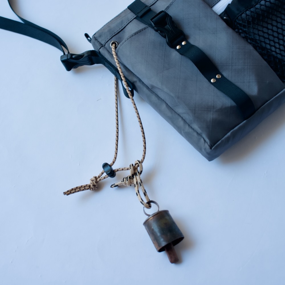 縦型のサコッシュです。「必要最小限の物だけを入れて、ハイキング中に目的の物を迷わずにすぐ取り出せる」がコンセプトです。縦型のため、アジャスターを調整して胸元まで引き寄せると体の前面に収まり、腕振り・脚上げなどハイキング中の体の動きへの干渉を軽減できます。